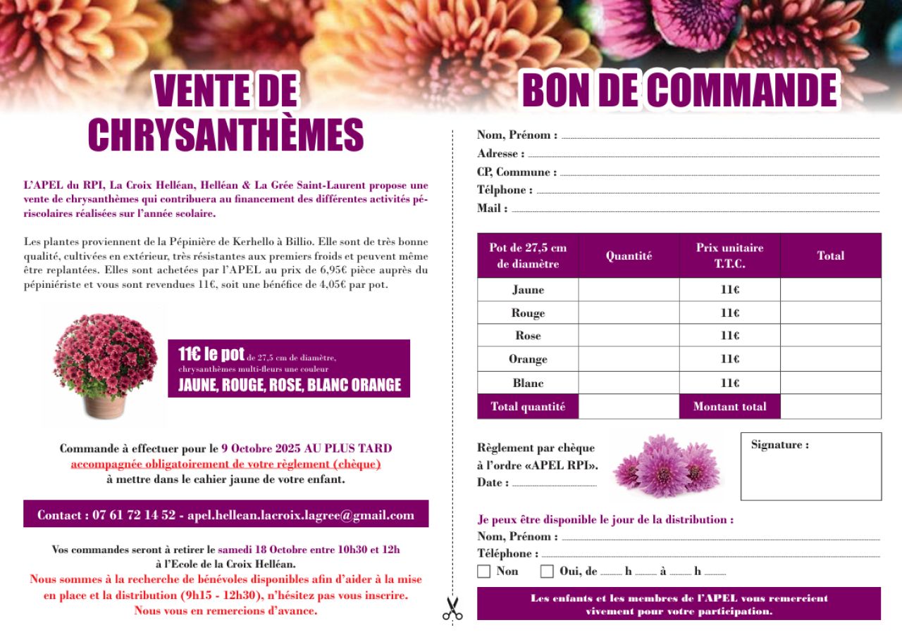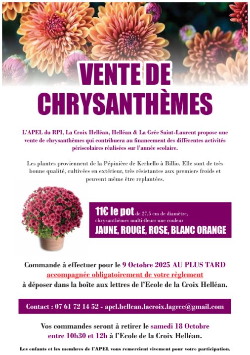 L'APEL du RPI organise comme chaque année une vente de chrysanthèmes.